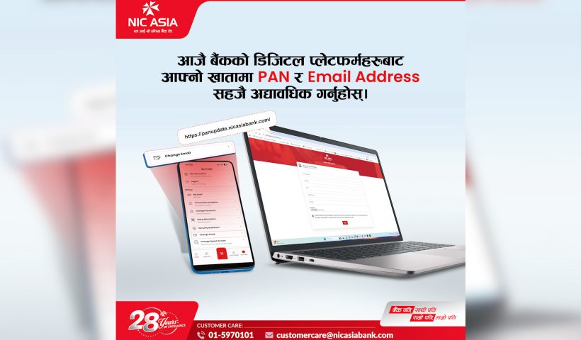 काठमाडौँ । एन आई सी एशिया बैंकले आफ्ना ग्राहकलाई खातामा स्थायी लेखा नम्बर (प्यान) र ईमेल ठेगाना अद्यावधिक गर्न अनुरोध गरेको छ। बैंकले माघ २८,…
