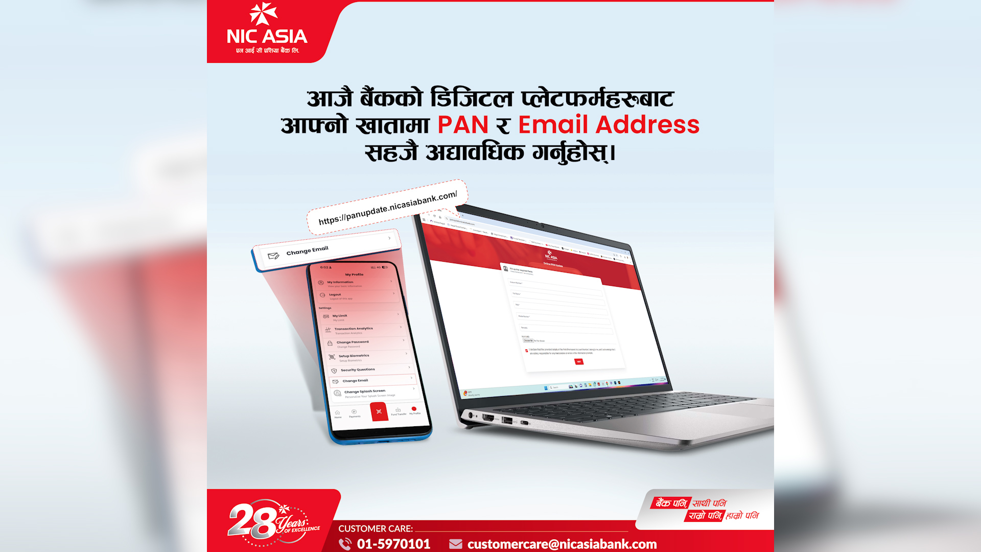 ग्राहकले बैंकको पोर्टल panupdate.nicasiabank.com वा मोबाइल बैंकिङ एप ‘NIC ASIA MoBank’ मा रहेको “PAN Update” विकल्पमा गएर प्यान अद्यावधिक गर्न सक्नेछन्। साथै आफूलाई पायक पर्ने बैंकको जुनसुकै शाखाबाट पनि प्यान अद्यावधिकका लागि आवेदन दिन सकिने व्यवस्था गरिएको छ।