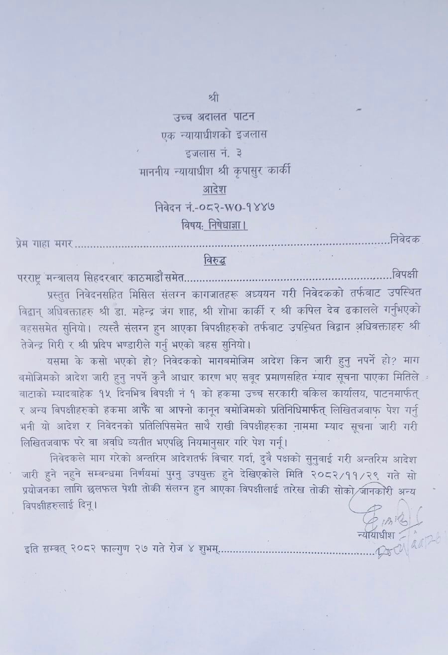 अदालतले अन्तरिम आदेश जारी गर्ने विषयमा छलफलका लागि २०८२ चैत २९ गते पेशी तोकेको जनाएको छ।
