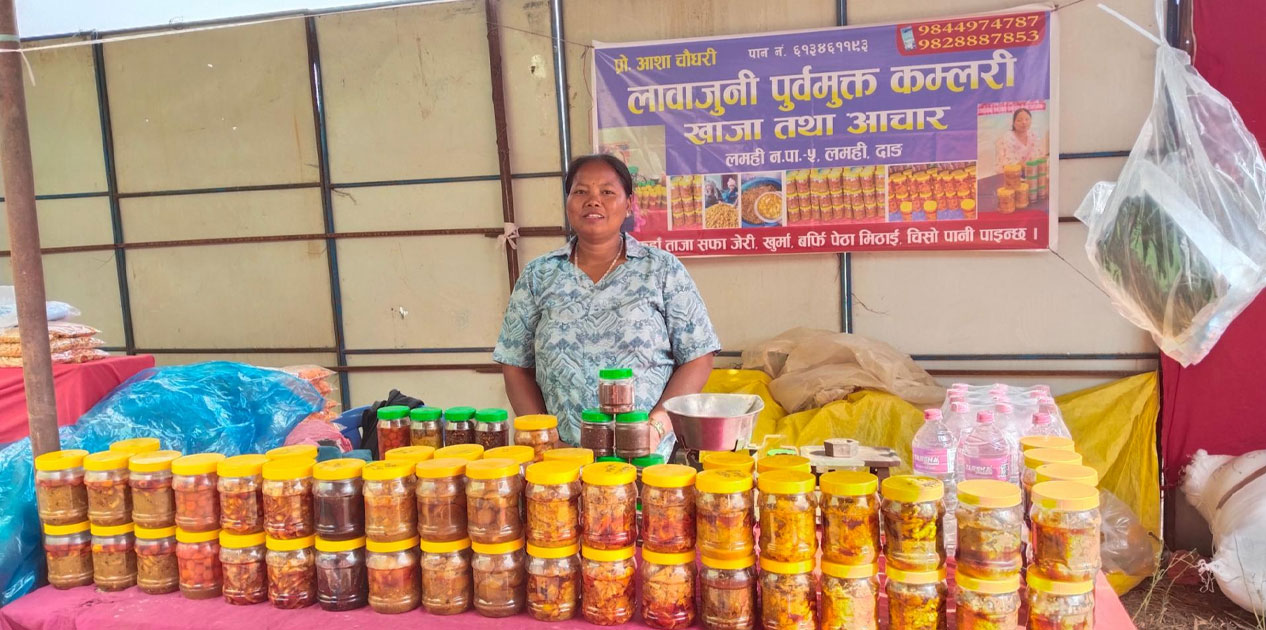 घोराही (दाङ) । लमही नगरपालिका–५ लमहीका आशारानी चौधरीको मुख्य पेसा अचार व्यवसाय हो । उहाँ अहिले अचार बिक्रीका लागि घोराहीमा जारी लुम्बिनी प्रदेशस्तरीय महोत्सवमा आउनुभएको छ । यही आफ्नो मुख्य पेसा भएका कारण जिल्लामा सञ्चालन हुने विभिन्न मेला महोत्सवमा जाने गरेको उहाँ बताउनुहुन्छ । आयआर्जनको राम्रो स्रोत भएका कारण अचार व्यवसायलाई विगत १३ वर्षदेखि निरन्तरता दिँदै आएको उहाँको भनाइ छ ।