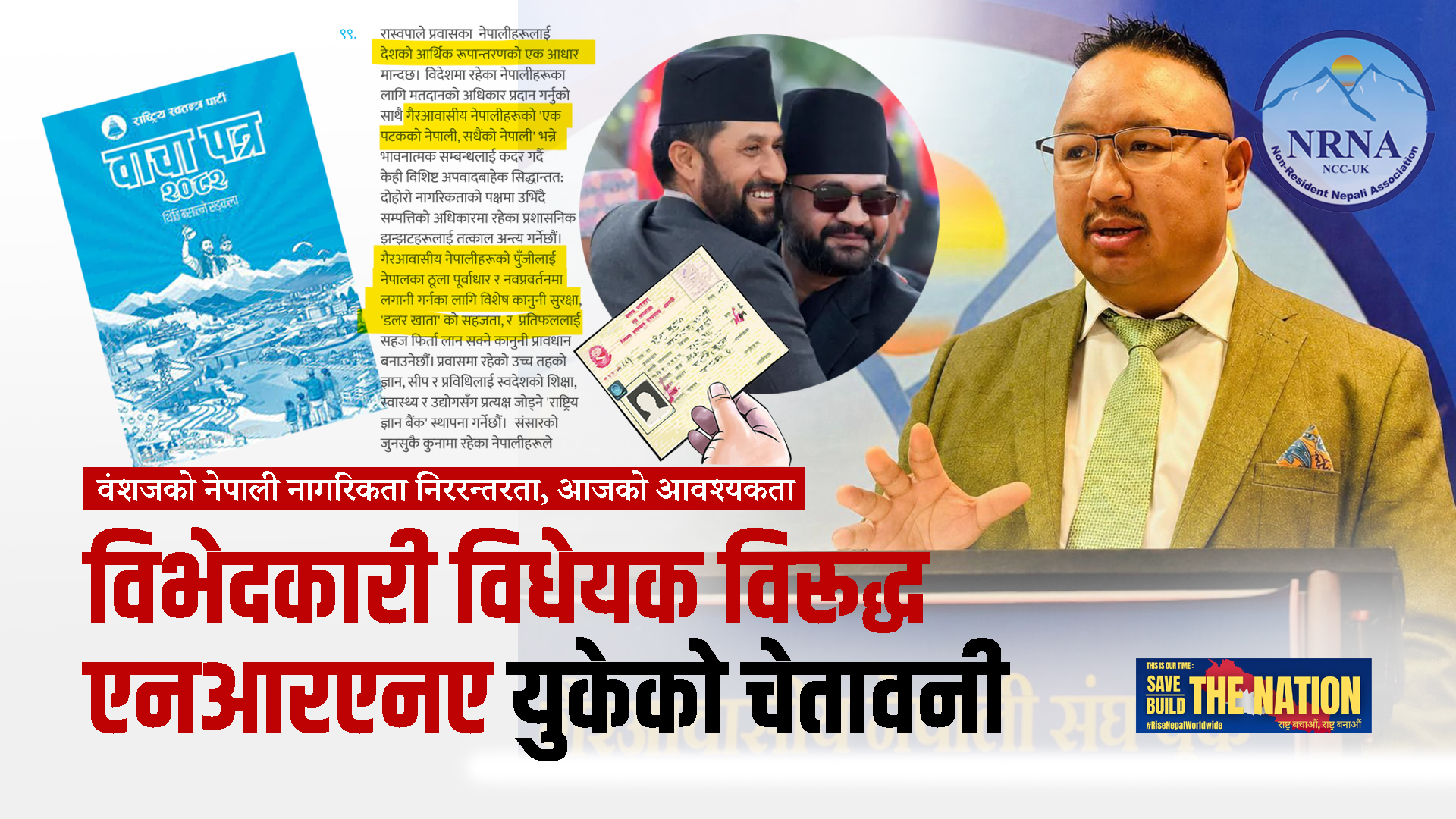 चुनावअघि वंशजको नेपाली नागरिकताको निरन्तरता सुनिश्चित गर्ने बाचा गरेको राष्ट्रिय स्वतन्त्र पार्टी (रास्वपा)ले सत्तामा पुगेपछि बाचा चटक्कै बिर्सेको छ । गैरआवासीय नेपाली (एनआरएन)लाई अप्ठ्यारो पर्ने गरीे ऐन संशोधनको प्रस्ताव ल्याएको भन्दै चर्को विरोध सुरु भएको हो । यसैसन्दर्भमा छलफलका लागि एनआरएनए (युके)ले २५ मे (सोमबार, Bank Holiday) एक बजे एल्डरसटस्थित एम्पाएर हलमा विशेष कार्यक्रमको आयोजना गरेको छ । अधिकारको लडाइँ भएकाले नेपाल सरकार र सम्बद्ध निकायलाई दवाव दिन युकेबासी नेपाली तथा गोर्खालीसहित विश्वभर रहेका गैरआवासीय नेपालीहरुलाई साथका लागि अध्यक्ष गाहाको आह्वान छ ।