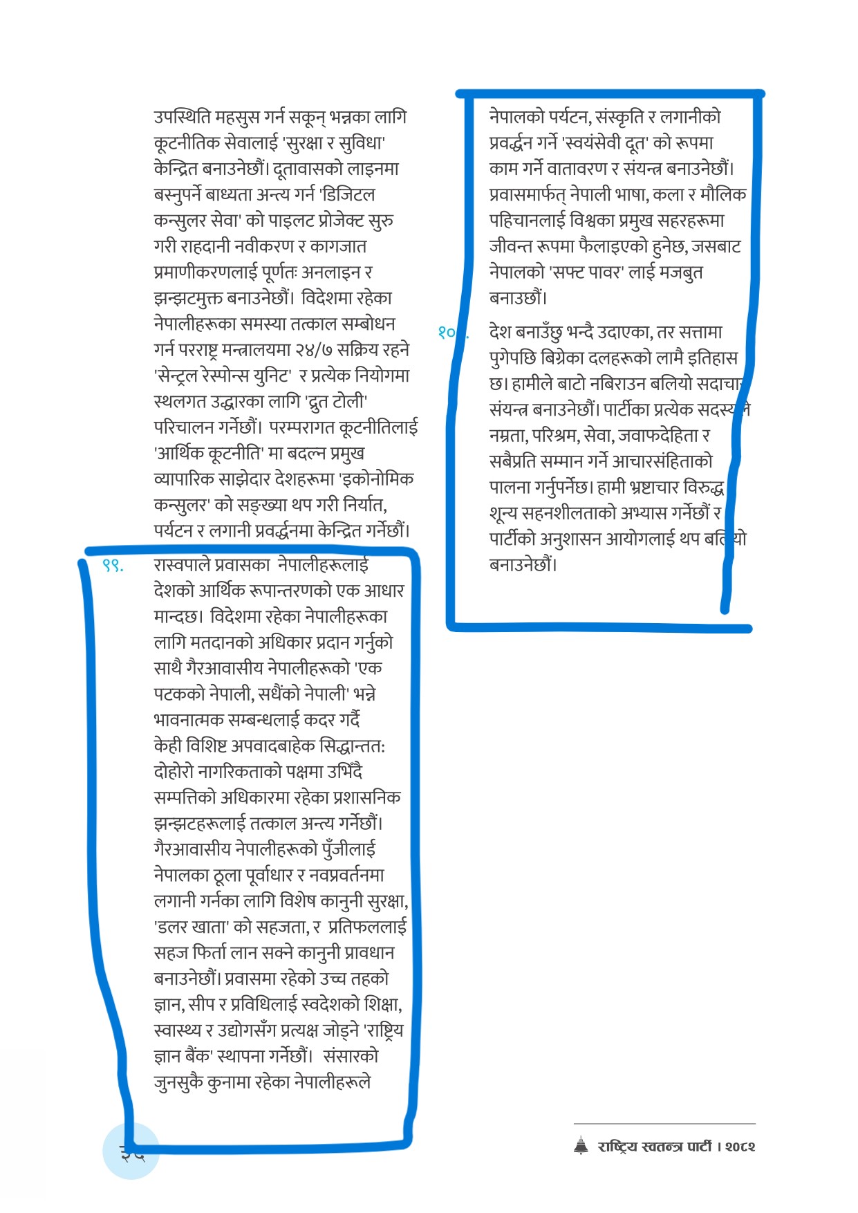- रास्वपाले कर्णालीबाट सार्वजनिक गरेको आफ्नो बाचापत्रको ९९ नंम्बर बुँदामा एक पटकको नेपाली सधैको नेपाली हुने र विदेशमा रहेका गैरआवासीय नेपालीको अनुकुलतामा बंशजको नागरिता र मताधिकारको व्यवस्था गर्ने भनेको थियो । त्यस अनुसार नेपालको संविधान २०७२ मा रहेको व्यवस्था र नागरिकता ऐनमा सामान्य संशोधन आवश्यक छ ।.