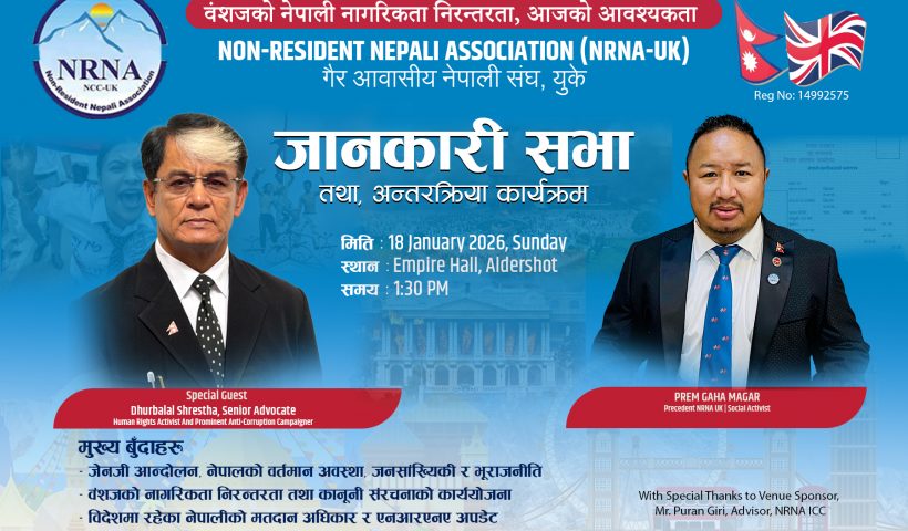 लण्डन । बेलायतस्थित गैरआवासीय नेपाली संघ (यूके)ले नेपालको समसामयिक राजनीतिबारे जानकारी दिन ‘जानकारी सभा तथा अन्तरक्रिया कार्यक्रम’ आयोजना गर्ने भएको छ। गत भदाै २३ र…